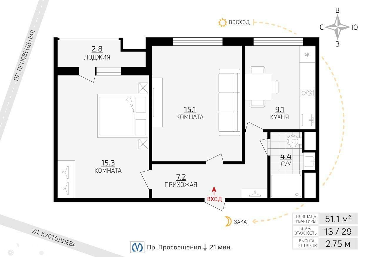 * До м. Проспект Просвещения – 20 мин пешком, 10 мин ( скоростные трамваи N 100 курсируют каждые 5 минут) автобусы 99,121,271