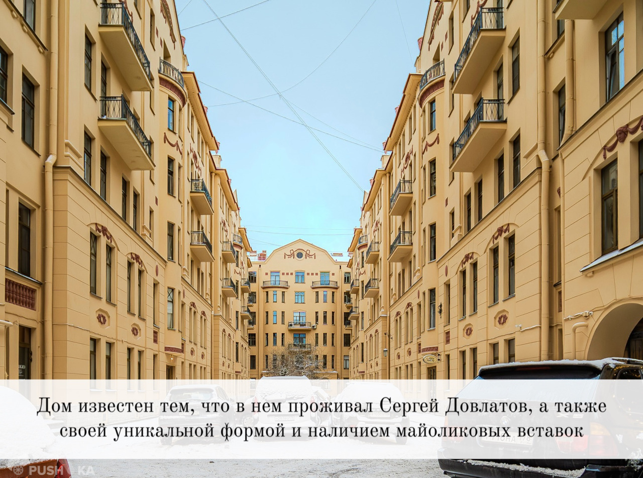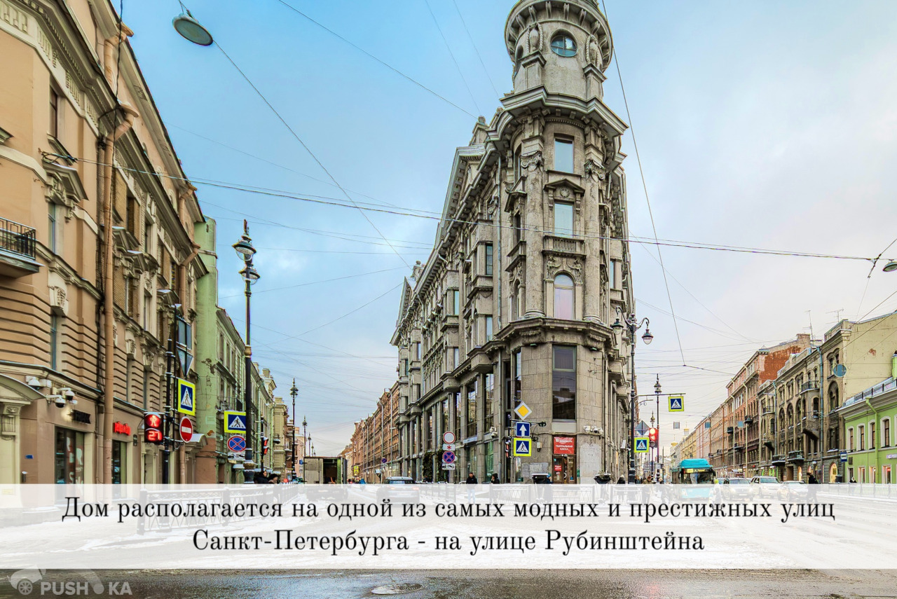 - Самый центр города, рядом множество кафе, известных престижных ресторанов (это главная ресторанная улица Санкт-Петербурга!), театры (МДТ), клубы, кинотеатр «Художественный», ТЦ «Галерея». Ближайшие станции метро (Достоевская/Владимирская) всего в 3 минутах ходьбы, рядом поликлиники, магазины, а сам дом является известной «довлатовской» локацией, связанной с писателем Сергеем Довлатовым