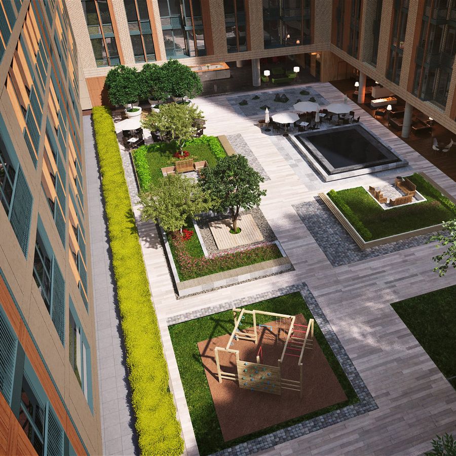 Зайдя на территорию внутреннего двора комплекса, Вы видите уютное многофункциональное пространство, защищённое от шума города стенами здания. Здесь созданы все условия для спокойного отдыха. Тротуары вымощены плиткой, вокруг — газоны, цветочные клумбы, декоративные кустарники, а в тени деревьев установлены уютные скамейки. Особое настроение создаёт созданный искусными ландшафтными дизайнерами «сад камней» и декоративный летний бассейн. Для юных жителей комплекса предусмотрен детский игровой комплекс. По вечерам территорию освещают изящные фонари, и вы погружаетесь в незабываемую атмосферу спокойствия и комфорта.